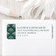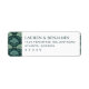 Dessa returadressetiketter har en sofistikerad och minimalistisk design, perfekt för formella tillfällen. Den vänstra sidan visar ett upprepat mönster av stiliserade bladmotiv i nyanser av grönt och turkos mot en djup marinblå bakgrund, vilket skapar en organisk känsla. Till höger presenterar ren, modern typografi anpassningsbar text med elegant avstånd, vilket förbättrar läsbarheten och balansen. Den övergripande stilen utstrålar förfining och lugn, vilket gör dessa etiketter idealiska för bröllop eller speciella evenemang.