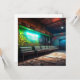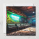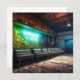Efter apokalyptisk övergiven byggnad med grönt graffiti och tomma sittplatser. Urban Decay, borttappad Space ai art.