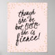 En vacker trycksak till din lilla flickas rums vägg som citerar Shakespeare, "även om hon är liten, är hon eldig!" i en djärv kursiv text med ett handskrivet utseende. Modern typografi djärvt tryckt i svart på en trendig blekrosa bakgrund dekorerad med guldfärgade konfettipunkter på övre och undre kanten.