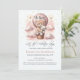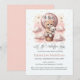 "Låt Äventyr påbörja" kallades babyduschinbjudan med en vacker orange genom att kattungen håller en nalle på en luftballong i rosa moln och omgivande guld-stjärnor i rosa vattenfärger. Vit stjärna mönster på rosa på inbjudan baksida. Mallar finns.