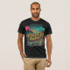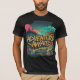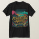 En pulserande och färgstark utformning med frasen "Äventyr Awaits" i en regnbåggradient omgiven av virvelmoln och berg, perfekt för dem som söker upphetsning och prospektering.