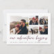 Ett modernt och spännande sätt att spara datumkortet för det äventyr-sinnade paret. Den här rena och enkla designen innehåller fem kvadratiska bilder i en rutnätslayout, med "äventyr börjar" ovan i ett burgunskt skript med vin-handen. Anpassa med ditt meddelande, namn och ytterligare information längs grund och lägg till mer (som din bröllop webbplats) längst bak.
