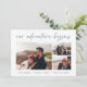 Ett modernt och spännande annonskort för förlovningen för det äventyr-sinnade paret, den här rena och enkla designen har tre vågrät- eller landskapsinriktade foton i en rutnätslayout, med "vår äventyr börjar" ovan i handskript. Anpassa med ditt tillkännagivande, namn, och ytterligare detaljer längs grund.