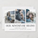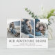 Du kan spara datumbildkortet för det utdoorsiska och äventyrliga paret, som är designat för att rymma tre av dina favoritfoton i förlovningen som är placerade sida vid sida, med ytterligare ett fullt-blekt foto på baksidan. "Våra Äventyr börjar" visas svart längs grund, med namn, bröllop och bröllop under. Lägg till webbplatsen bröllop i baksidan och en indikation på att en formell inbjudan kommer att följa.