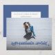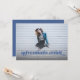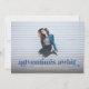 Detta examensmeddelande och inbjudan med foto som går ut till kanterna har orden "äventyr väntar" i blått. Det finns utrymme för din examenkandidats uppgifter på framsidan och ännu mer utrymme för text på baksidan av kortet.