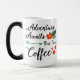 Äventyr väntar på men första kaffet Motiverande, inspirerande dekorativ Humor-typografi, kaffets Mugg-design