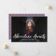 Trendig tillkännagivande för studenten med student vågrät-fotot med "Äventyr Awaits" i vit handskriven skrift. Anpassa Äventyr i Awaits tillkännagivande för studenten genom att lägga till student namn, namn och studenten. Tillkännagivandet går tillbaka till visning, elegant lila och vit trellis mönster.
