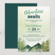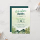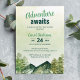 En charmig akvarelldesign med berg, tallar och en rustik känsla, perfekt för en pojkes skogstematiska barnkalas. "Äventyr väntar" Anpassa enkelt med din festinformation.
