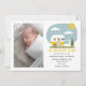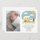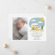 Illustration av en gul husvagn med barnkläder på tvättlina med "Äventyret Börjar" och anpassad text för barnets namn och födelseuppgifter. Ersätt bild med din egen.