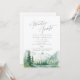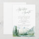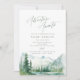 Vattenfärgsskog med frodig grön tall, tealflod och dimmig bergsformation med modern, elegant och romantisk samtida äventyrligtypsnitt, en fin inbjudan till boho-rustik bröllopsfest och bergsskog-destinationbröllop under vår och sommar.