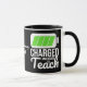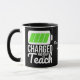 Mugg är en perfekt för en lärare som återvänder till skolan efter en semester, som är avslappnad, utvilad och laddad. Utformningen har ett fulladdat vitt batteri med grönt laddad linjer och vit skrivning med ord laddad och Redo till styck på ett svart mugg. Mugg kan vara personlig genom att ändra namn och klass på den.