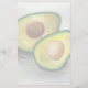 Vattenfärgning av en färsk grönt avokado som är skuren i halvfärg. Gråaktig och blå fläckig bakgrund.
