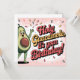 En starkt färgad, fantasifull serieillustration perfekt för ett födelsedags-kort eller ett socialt media-inlägg. Brännpunkten är en söt, personifierad avokado med ett leende ansikte, rosa kinder och höga klackar, som står i en självsäker, firande pose. Bredvid figuren finns den humoristiska, retro-inspirerade texten: "Heliga Guacamole, det är din födelsedag!" Bakgrunden är en mjuk rosa färg med spridda konfetti och en lekfull, nostalgisk estetik.