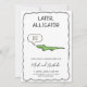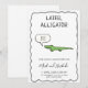 En rolig avskedsfest inbjudan med en leende alligator. Kortet är lätt att anpassa med din text, teckensnitt, teckensnittsfärg, pappersform alternativ och val av papperstyper. Inte exakt vad du söker? Alla våra produkter kan skräddarsys för att möta dina behov utan extra kostnad. Kontakta oss bara