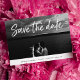 Ett modernt Spara datumkortet med en färsk och avslappnad handskriven typografi stil som framkallar ett penselmärke. Det här chicen är designat för att rymma ditt favoritfoto för vågrät eller landskapsinriktad förlovning med fullt, och innehåller "spara datumet" som en vit textövertäckning överst med namn, bröllop datum och bröllop som visas i svartvitt längs grund. Kort som går tillbaka till ett subtilt ikat mönster med utrymme för att inkludera webbplatsens URL för bröllop eller ytterligare information som du väljer.