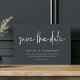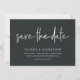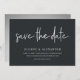 Ett modernt sätt att spara datumkortet designat för par eller bröllop. "Spara datumet" visas i faux silver foil avslappnad handskriftlig skrift. Anpassa med namn, bröllop-datum och bröllop under i vitt skrivet på en mjuk svart bakgrund.