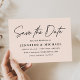 Spara datumkortet med "Spara datumet" i ett svart handskrivet skript med bakgrund. Anpassa det moderna Spara datumkortet genom att lägga till namn, datum för bröllop, plats för bröllop, bröllop webbplats osv. Datumkortets minimalistsparande går tillbaka till visningen med en solid bakgrund med utrymme för ytterligare text och foton.