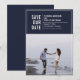 Fet och avslappnad vit typografi och ram, ett enda foto sparar datumkortet med marinblå färg bakgrunder.
