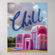 Denna design har en livfull 3D-text “Chill” i en blank blå färg, mot en bakgrund av ett uppblåsbart slott och en klar blå himmel med fluffiga moln. Det lekfulla och feta teckensnittet fångar essensen av avkoppling och kul, perfekt för alla som vill uttrycka sin kärlek till avslappnade vibbar och soliga dagar.