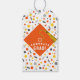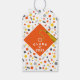 Kreativa gratulationspresentkort och presenttips för avslutning, med orange mössa och en guldräfsa på konfettibakgrund. Redigera texten för att lägga till examenens namn och avgångsklassens år.