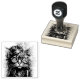 A fierce looking dark gray and black pussy cat wearing a leather hat with steampunk brass on it. A bronze feather tops the cock-eyed hat. This beautiful feline is wearing a golden or amber lensed monocle giving one eye a bronze tone, Around the cats neck hangs a brass trinket of some kind adding to the overall Steampunk attire.