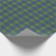 Gift wrap med distriktstranden till Ayrshire, Skottland. Traditionell skotsk präglade mönster i blått och grönt med ljusröda högdagrar och gulter.