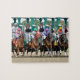 Avbrottet från den starta grinden i de Pennsylvania mästareinsatserna. Några av de bäst thoroughbredsna i landet lämnar den starta grinden. Aztec avkänning (6) i vit- och gröntsilken med röd skygglappar, taktmästare samlade (7), den kastanjebruna colten på yttersidan.