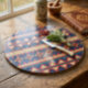 Ge färg och kultur till ditt kök med denna *Aztec Elegance* skärabräda i glas. Designad med djärva röda, blå och beige stamningsmönster, fungerar detta härdade glasstycke både som funktionellt förberedelseutrymme och iögonfallande dekoration. Lägg till en touch av sydvästlig charm på din köksbänk!