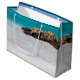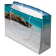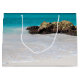 Giftväska med ett vackert foto. En vit sandstrand, med en försiktig surfa. Tropiskt turkos vatten omger ett taggigt sten.
