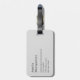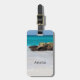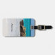 Ett bagagemärke med ett vackert foto. En vit sandstrand, med en försiktig surfa. Tropiskt turkos vatten omger ett taggigt sten.