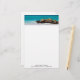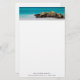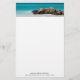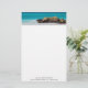 Stationär med ett vackert foto. En vit sandstrand, med en försiktig surfa. Tropiskt turkos vatten omger ett taggigt sten.