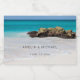 Bröllop flaska-etiketter med ett vackert foto. En vit sandstrand, med en försiktig surfa. Tropiskt turkos vatten omger ett taggigt sten.