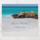 Bröllop flaska-etiketter med ett vackert foto. En vit sandstrand, med en försiktig surfa. Tropiskt turkos vatten omger ett taggigt sten.