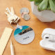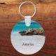 Nyckelkedja med ett vackert foto. En vit sandstrand, med en försiktig surfa. Tropiskt turkos vatten omger ett taggigt sten.