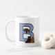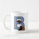 Den här bilden visar en personlig mugg-design för individer med namn som börjar med brev B. I illustrationen finns ett stort blått brev B med lekande tecknad, en björn ljugande ovanpå B och två björnar sitta vid sidan av B. Under brev kan texten stå "Benjamin" i stället för "Benjamin" i ett annat namn som börjar med brev B för att skräddarsy det till mottagaren. Belastningsillustrationerna ger en mysigt, visuell beröring till den övergripande utformningen. Den här typen av personlig mugg gör ett underbart dekorativt biet för: - Gift för födelsedagar, babyduschar eller döttrar - Firande av individer vars namn börjar med brev B