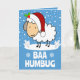 Ett bedårande kort för dem som är lite grinig under höstlovet. Ett sött tecknat får som bär en röd och vit tomtehatt som sticker ut i snön mot en blå bakgrund. Nedanför står orden "BAA HUMBUG" i ett roligt vitt typsnitt.