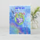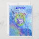 En blå, grönt och röd marmorerad bakgrund med en födelsedagskalas och ett ljus i mitten av inbjudan och den roligt lekande ord som säger spara datumet i blått brev. Baksidan av kortet har baby 1 födelsedag med datum, tid och ställe i samma blå brev. matchande porto, anteckningskort och magnet.