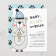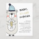 Kortet Vinter Baby Shower har en söt, rolig björn i hatt, liten fisk och text Baby det är kall utanför. Baksidan av detta babyvykort har lustigt mönster med vildens björnspår och dammig blå bakgrund.