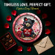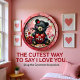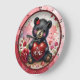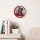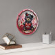 This charming circular wall clock features a whimsical watercolor-style illustration of a fluffy dark grey baby bear with large, sweet eyes. The bear is affectionately holding a large, sparkling red heart that features the embossed text "BE MINE" in white. The scene is decorated with beautiful red and pink roses, green leaves, and delicate flower petals scattered across the bottom. The background is filled with soft, artistic watercolor splashes in shades of pink and red. A vibrant pink and red watercolor-themed decorative border frames the entire image. The clock face border includes stylized numbers from 1 to 12 positioned around the edge, with simple black hands indicating the time.