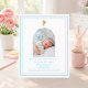 En vit bakgrund, dekorerad med en babyblå ram, och ett gyllene kors Anpassa och lägg till ett foto namn och detaljer. Blå text. Bågformad fotoram.