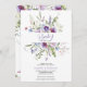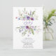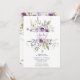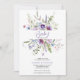 Denna trendiga baby shower inbjudan har akvarell ljusblå och violett, blekrosa vilda blommor, gröna blad och grenar.