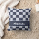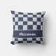 Känner du en liten pojke som nyligen har anslutit sig till din vän- eller familjekrets? Denna kudde till barnkammaren har ett rutmönstrat överkastsmönster i alternerande mörk- och ljusblå färger och är personlig med den lilla pojkens namn. Det fyrkantiga mönstret fyller framsidan av denna kudde tillsammans med en matchande banner för barnets namn. Baksidan av kuddens överdrag är enfärgat blå vilket ger gott om utrymme för ytterligare text eller foton.
