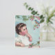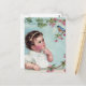 Ett litet barn tittar intensivt på blåfågeln vid en blommar träd gren. Utformning av vintagen är söt i mjukt akvarium och rosa färg.