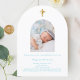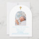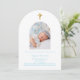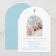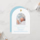 En vit bakgrund, dekorerad med ett gyllene kor personalize och lägg till ett foto namn och detaljer. Baby blue text. Arch-format foto ram.