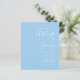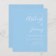 Den här enkla, moderna bröllopsinbjudan innehåller vit text på en pastellbaserad baby blue bakgrund. Lägg till bildens och bildens namn i snyggtens handskriftsgrafi och detaljerna i sans serif-teckensnitt. Den omvända sidan är en matchande skugga av solid baby blue.