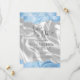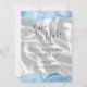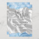 Det moderna bröllop spara datum-kortet överst och grund i eleganten har ett baby blue vattenfärgat pastellfärgat gräns som trimmas med faux silver glitter. Anpassadet kombinerar grått-handskrift med kol och sans serif typsnitt på en bakgrundsbild av vit silke eller satin. Den omvända sidan har en matchande pastellblå agate och vit silke-design.