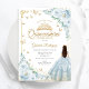Baby blue inbjudan, guld och vit Quinceanera firande. Med brunettflicka i boll-klänning, typsnitt, guld-fjärilar, dammiga blå ro och tiara. Perfekt för en elegant prinsessan stil glam firande. Anpassa med dina egna detaljer. Skrivna Zazzle-inbjudningar eller digital utskrivbar mall för omedelbar nedladdning.
