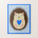 Denna fantastiska pusselbild har en digital konstbild av en söt brun taggig baby pojk igelkott med bruna ögonlock och en stor leende, som håller ett blått hjärta. En bra design för att fira en baby pojke.