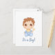 Söt tecknad baby klädd i en blå overall med en gul matsalva som håller i en babyrassel.