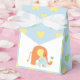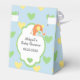 This baby shower favor box is printed in a colorful pastel green and yellow heart pattern accented with a cute mom and baby elephant (blue) and is ready for you to personalize on the back with your own text. See matching shower invitation, paper plates, napkins and other matching items in this same collection.